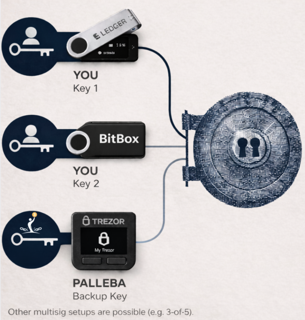 In a standard 2-of-3 multisig setup, you hold two keys, while Palleba securely holds one backup key.